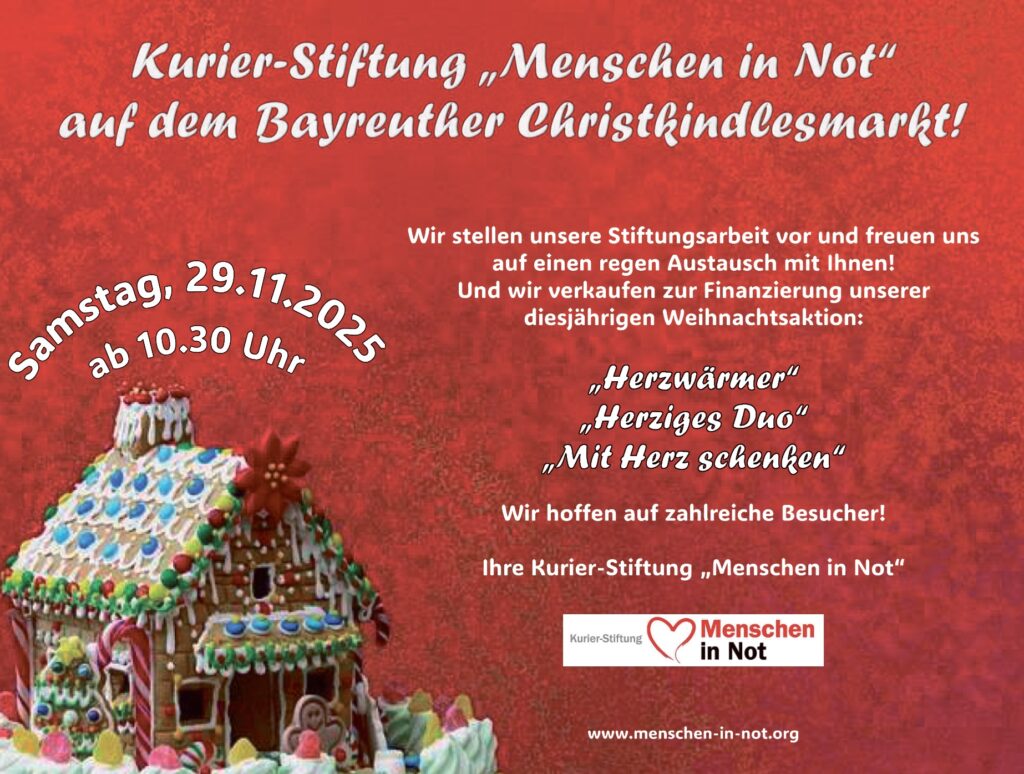 Am 29. November 2025 sind wir in einem der Kreativstände auf dem Bayreuther Christkindlesmarkt vertreten. Wir freuen uns auf den Austausch mit Ihnen und bieten auch einige unserer exklusiven Stiftungsgeschenke an. Lassen Sie sich überraschen!