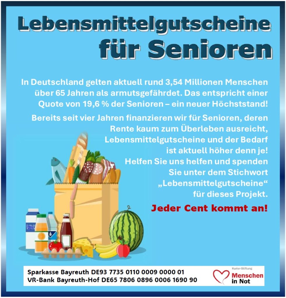 Die Konsequenz für die Kurier-Stiftung „Menschen in Not“: Das Projekt wird auf eine breitere Basis gestellt. Lebensmittelgutscheine werden künftig auch über das Seniorenamt der Stadt Bayreuth und bei präventiven Hausbesuchen der Mitarbeiter verteilt, um auch verstärkt diejenigen zu erreichen, die aus falsch verstandener Scham keine Hilfe direkt aufsuchen. Till Salzmann, der Leiter des Seniorenamtes, und sein Team sind glücklich über diese Lösung: „Die Stiftung ist für die Mobile Seniorenberatung ein wichtiger Ansprechpartner. Mit ihrer Unterstützung können wir gemeinsam älteren Menschen in Notsituationen unkompliziert helfen.“