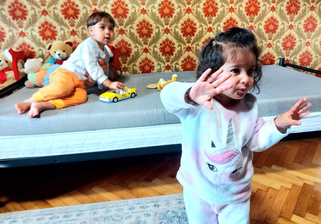 Ein Teppich und etliche Spiel- und Bastelsachen, finanziert von der Kurier-Stiftung „Menschen in Not“, sorgen dafür, dass sich die Kinder gerne hier aufhalten. Zwei Betten und ein Sofa dienen als Sitz- und Spielgelegenheiten. Für die älteren Kinder gibt es Spinde, in denen sie ihre Bastelsachen und Puzzles sicher vor den Kleineren verwahren können. Die Schranktüren haben die Kinder mit selbst gemalten Bildern verziert. Daniela Löblein räumt gemeinsam mit Shima Varmili die Spielsachen in die Schränke ein.