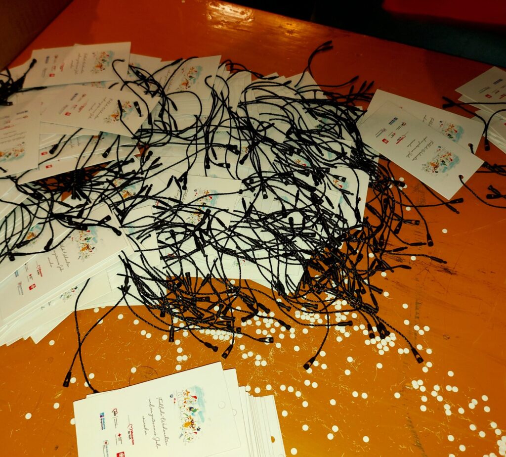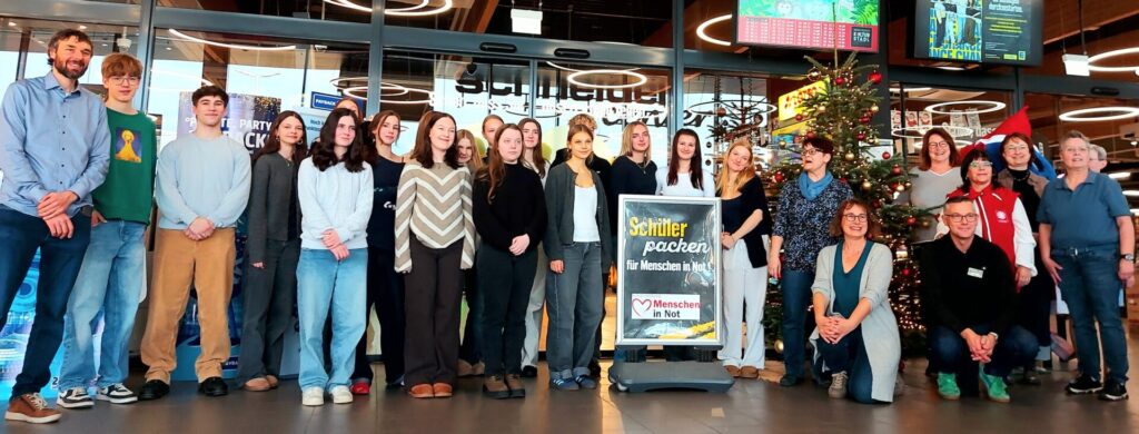 Auch Klasslehrer Florian Baum, der normalerweise Biologie und Chemie am MWG unterrichtet, ist begeistert. Genau so wie Marlene Franck, Marlon Matros und Mia Witt. Die drei 15-Jährigen hatten zwar selbst noch keine Berührungspunkte mit Armut, sind aber überzeugt davon, dass die Probleme auch hier in der Region zunehmen, „weil einfach alles teurer wird.“ Umso dankbarer sind sie für das Weihnachtsfest, das für alle drei vor allem Familie und Tradition bedeutet und Nähe zu den Menschen, die ihnen wichtig sind. Und Marlene Franck ist überzeugt. „Schenken macht definitiv mehr Spaß als Nehmen.“ Und das merkt man den Zehntklässlern an, spätestens als Weihnachtsmusik aus der Boombox ertönt und die Arbeit noch viel schneller von der Hand geht.