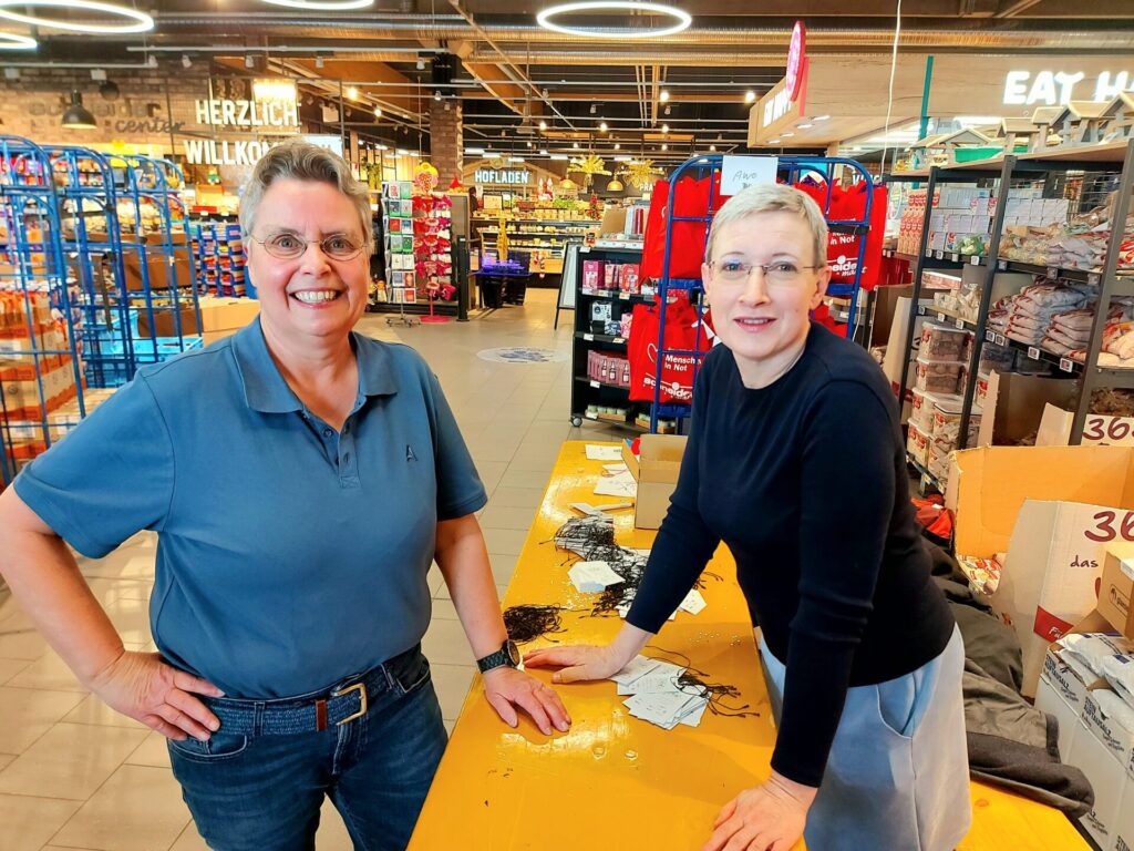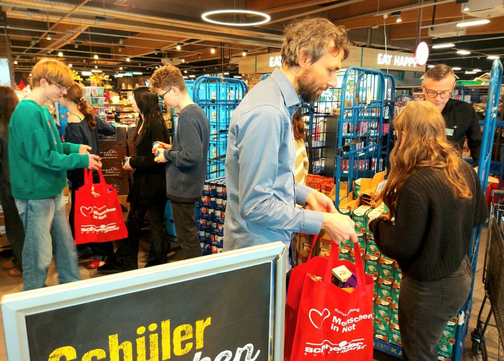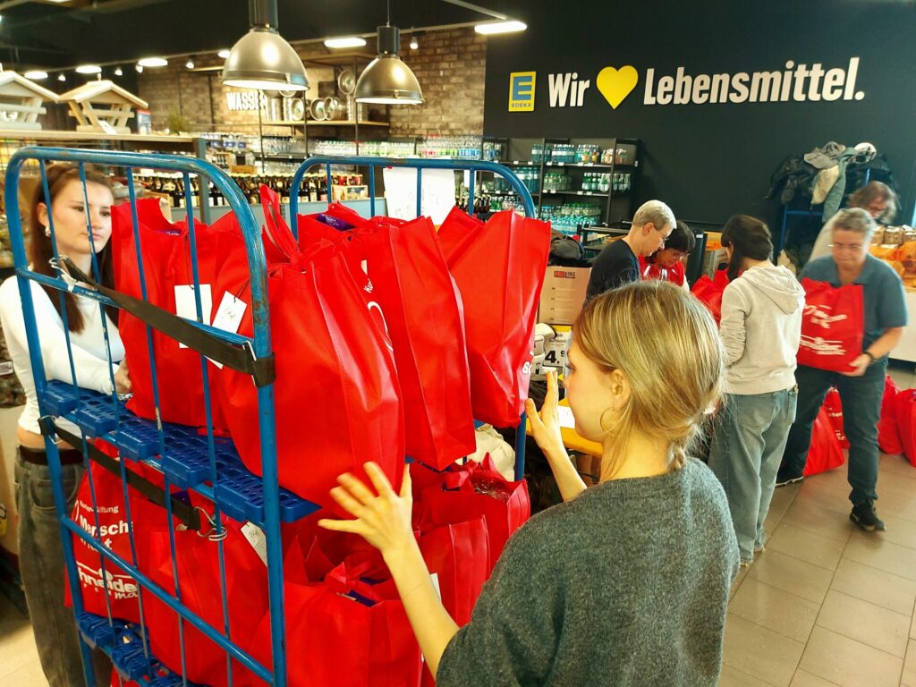 Mit dabei: fünf Wohlfahrtsverbände, die den logistischen Aspekt stemmen und eine Schulklasse, die gemeinsam mit dem Stiftungs-Team in Windeseile die Tüten befüllte, sodass nach gut zwei Stunden schon fast alles geschafft war. Auch dank der hervorragenden Vorbereitungsarbeit von Bezirksleiter Maik Richter, der im Eingangsbereich des Edeka-Centers in der Otto-Hahn-Straße alles angerichtet hatte. Palettenweise standen Nudeln, Reis, Lebkuchen, Kaffee, Tee und vieles mehr bereit, aber auch Info-Tafeln, damit die Kunden an diesem Tag genau wussten, was hier passiert.