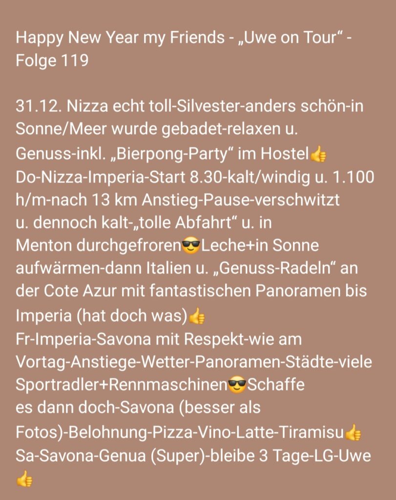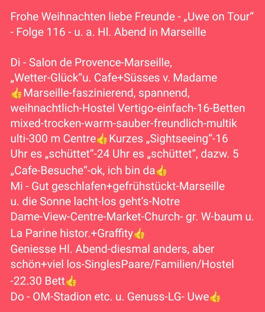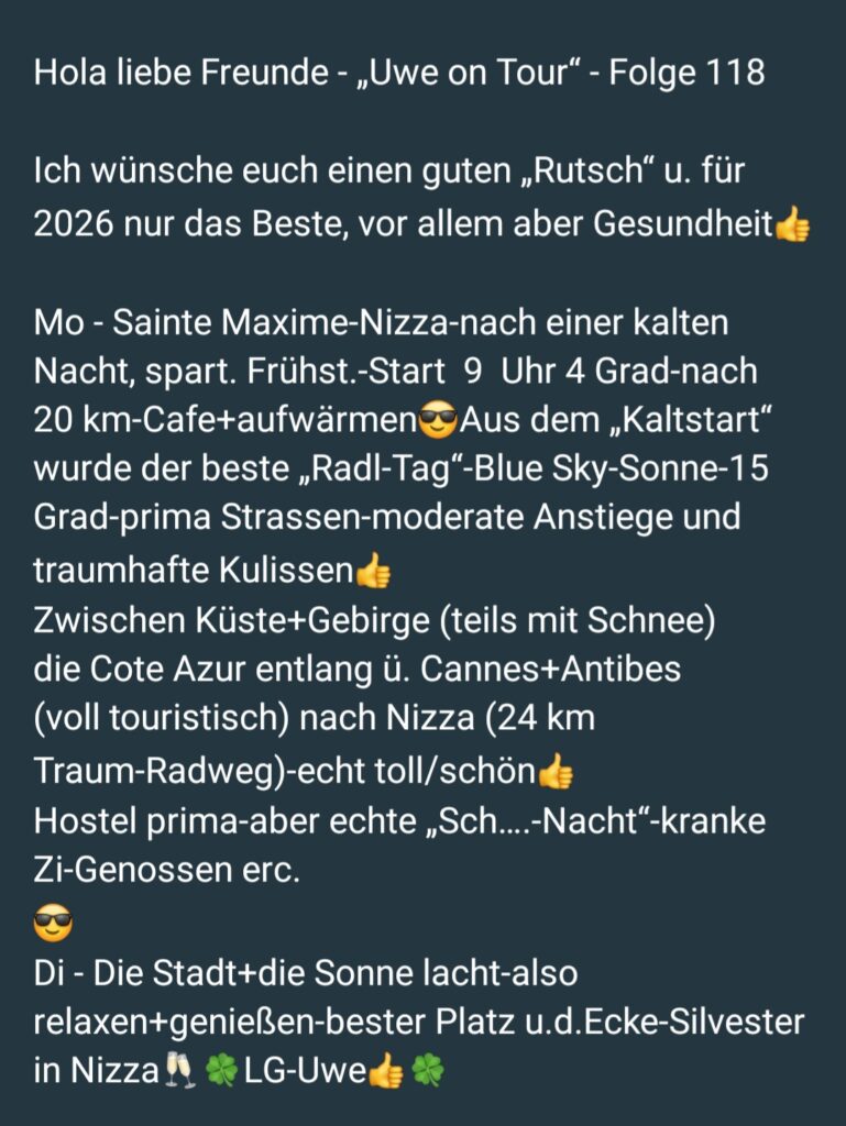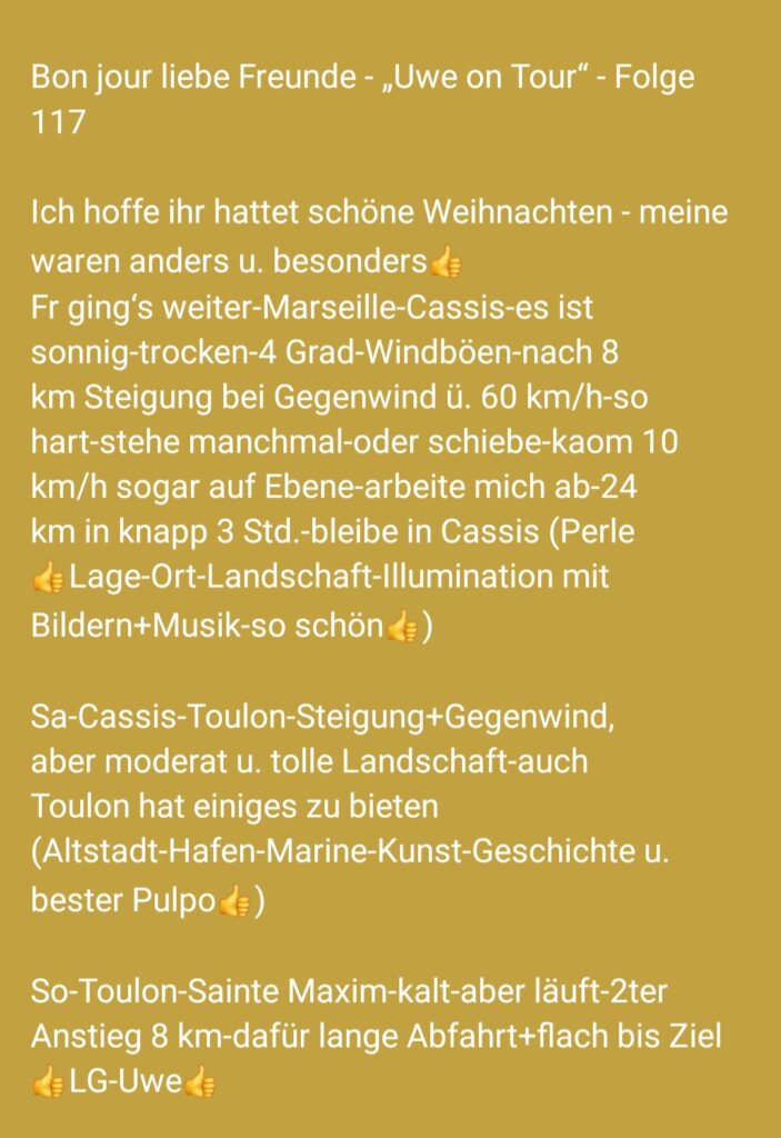 Ab Dienstag dann wieder im Fahrradsattel in Richtung Lloret de mar. Ob es jemals so etwas wie Heimweh gab auf der Reise? Schließlich hatte er gerade in den letzten Wochen so manche Panne zu bewältigen. Zweimal wurde ihm das Fahrrad gestohlen und er musste ein neues kaufen. Dank Raphael, der sich unterwegs seiner annahm, wurde ein Reifen geflickt. Doch solche Erlebnisse waren eher selten. Trotzdem sagt er: „Mir fehlt nichts, nur eine gute Unterhaltung mit Familie oder Freunden vermisse ich manchmal.“ Und auch dem Heilig Abend, den er irgendwo in Frankreich verbringen möchte, sieht er gelassen entgegen. „Heiligabend ist für Menschen, die ungewollt alleine sind oder nirgendwo eingeladen werden, ein schlimmer Tag, aber ich bin ja freiwillig unterwegs“.