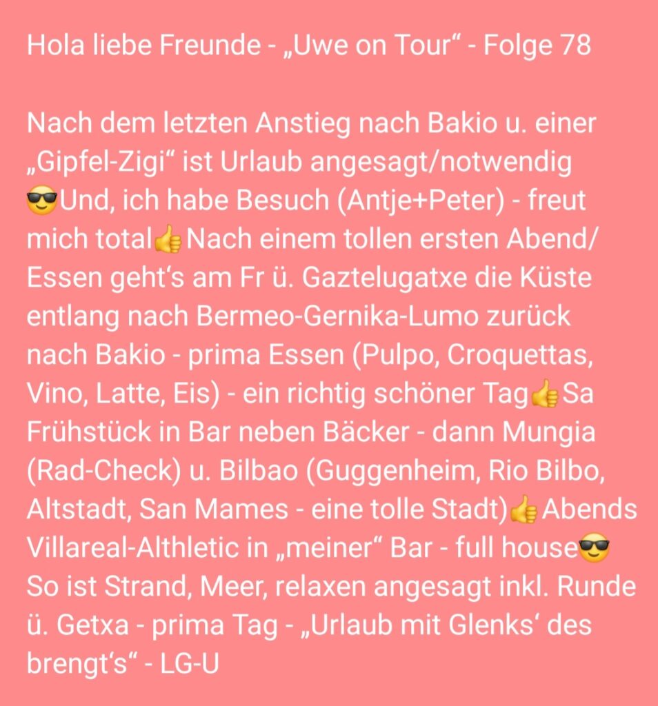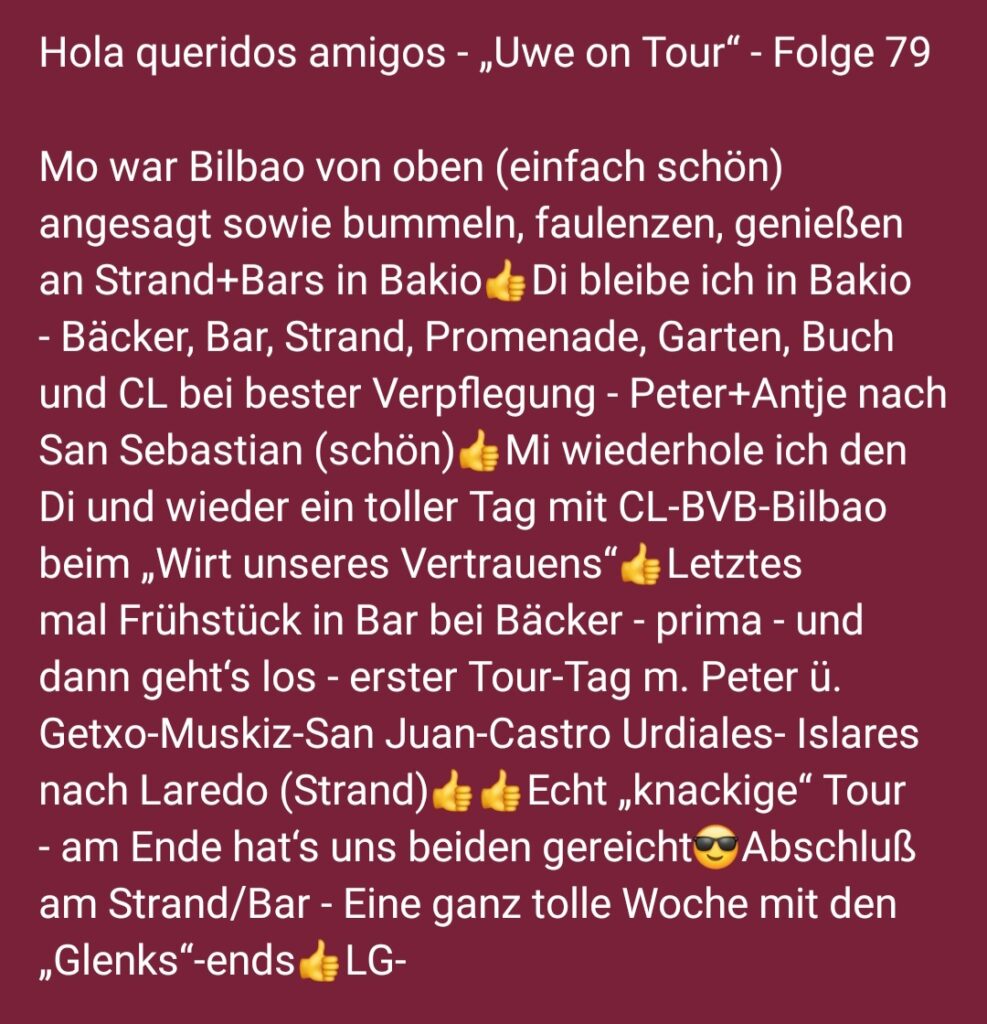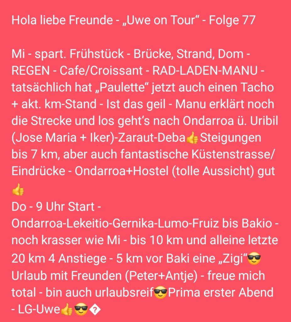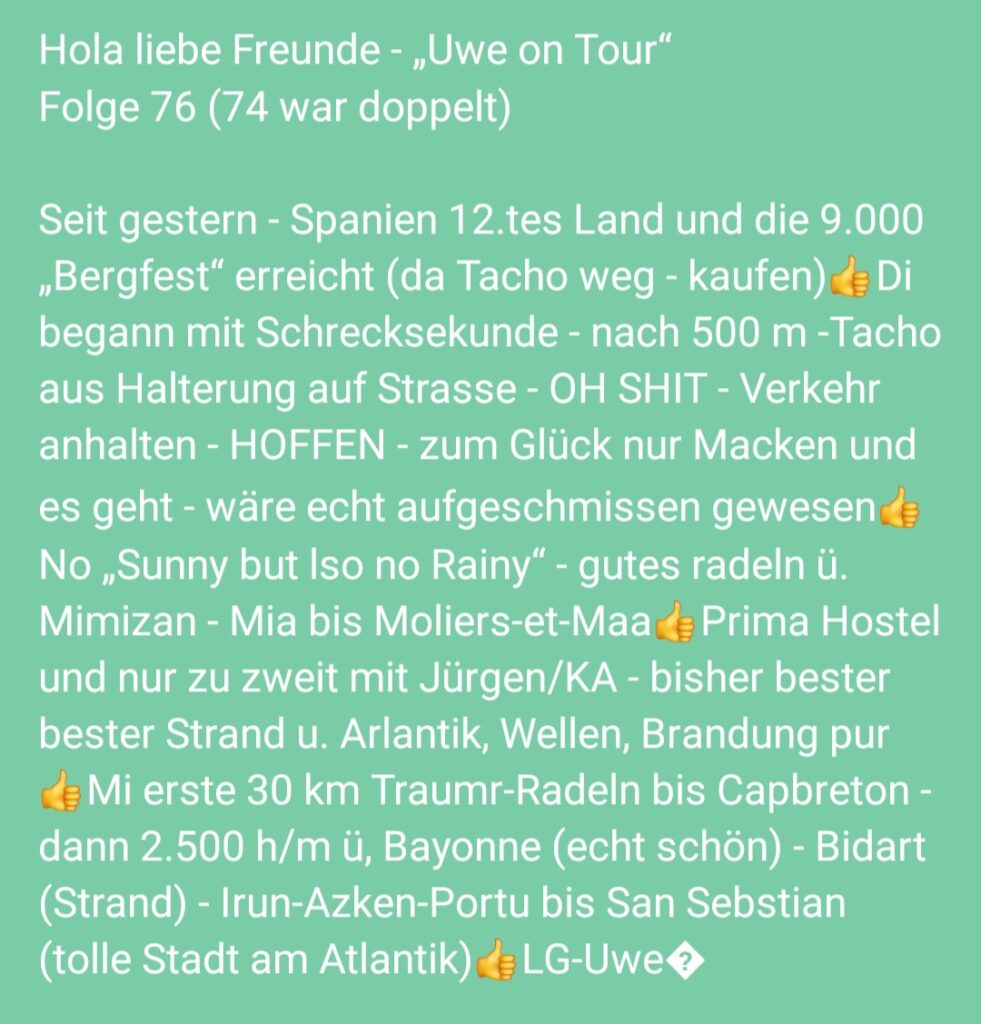 Ein Fahrrad – nicht schwarz wie sein bisheriges, sondern türkisfarben. Und damit geht ein schwarzer Sonntag zu Ende mit neuen Perspektiven. Bilbao ist das nächste Ziel, das Uwe Prokscha ansteuert, und dann sollen die 9.000 auf dem Tacho stehen. Und die Begegnung mit einem guten Freund, der ihn ein Stück weit begleiten wird.