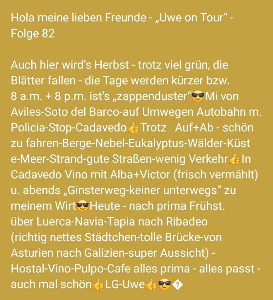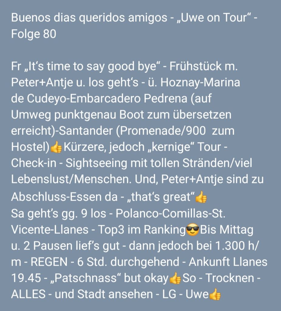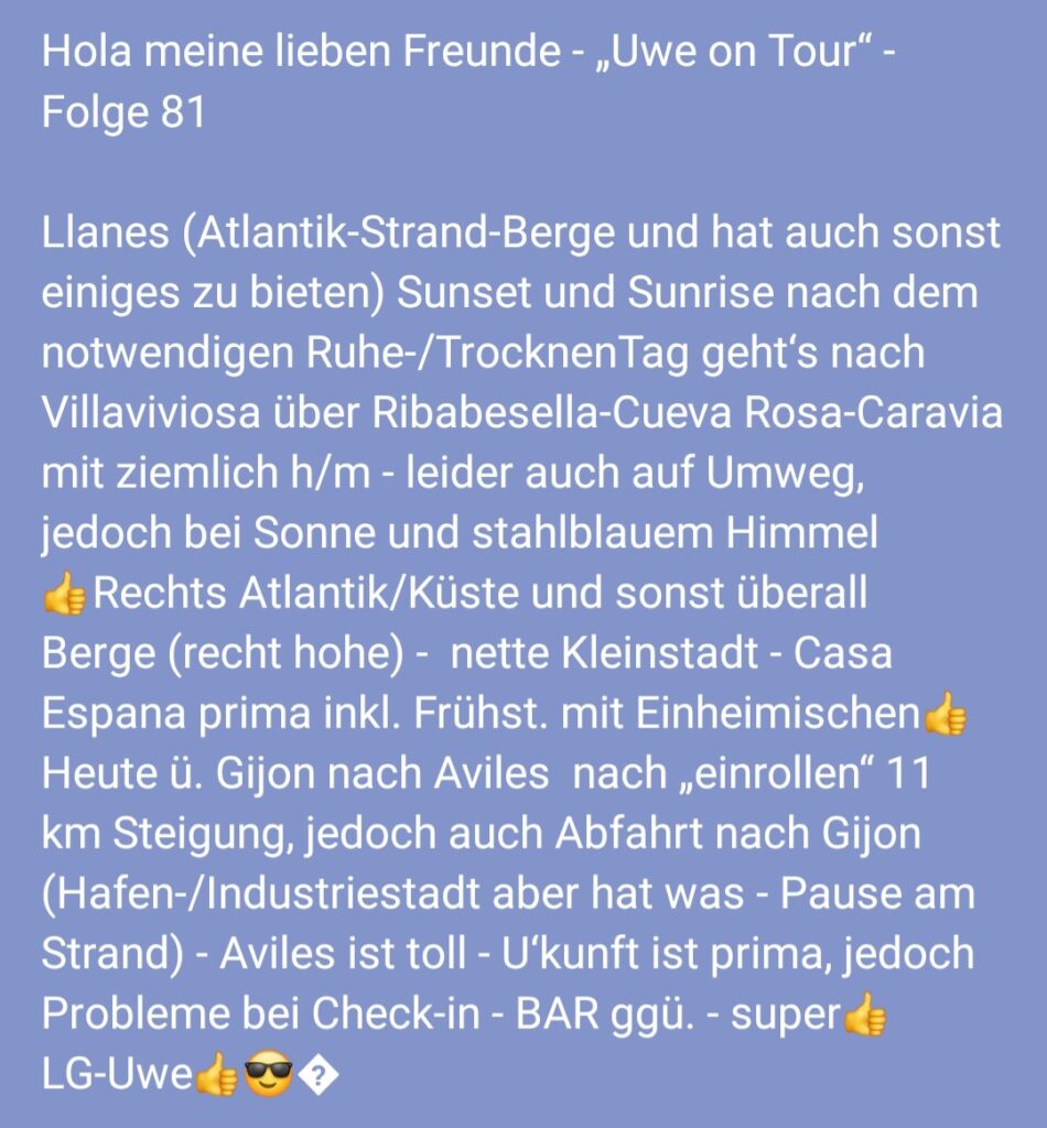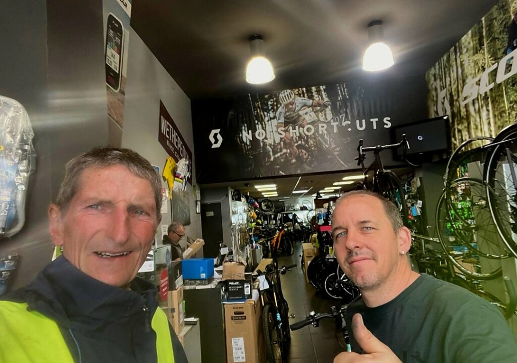 Ein Fahrrad – nicht schwarz wie sein bisheriges, sondern türkisfarben. Und damit geht ein schwarzer Sonntag zu Ende mit neuen Perspektiven. Bilbao ist das nächste Ziel, das Uwe Prokscha ansteuert, und dann sollen die 9.000 auf dem Tacho stehen. Und die Begegnung mit einem guten Freund, der ihn ein Stück weit begleiten wird.
