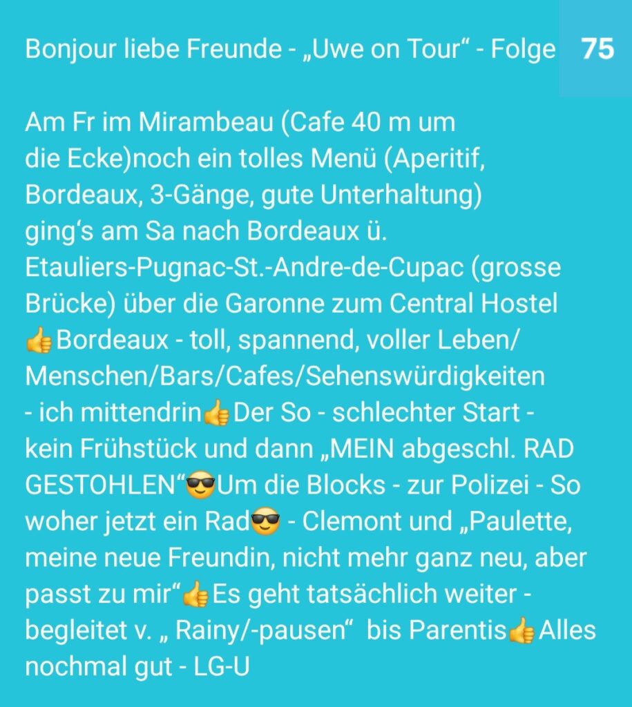 In Bordeaux bezieht Prokscha in einer Jugendherberge Quartier. Und traut seinen Augen nicht, als er am nächsten Morgen – noch ohne Frühstück – auf die Straße tritt: Das Fahrrad ist weg, obwohl es abgesperrt war. Das übliche Prozedere: Anzeige bei der Polizei. Aber wie sollte es weitergehen? Diesmal ist Clement der Retter. In seinem Radgeschäft wird „Paulette“ zur neuen Freundin von Uwe Prokscha.